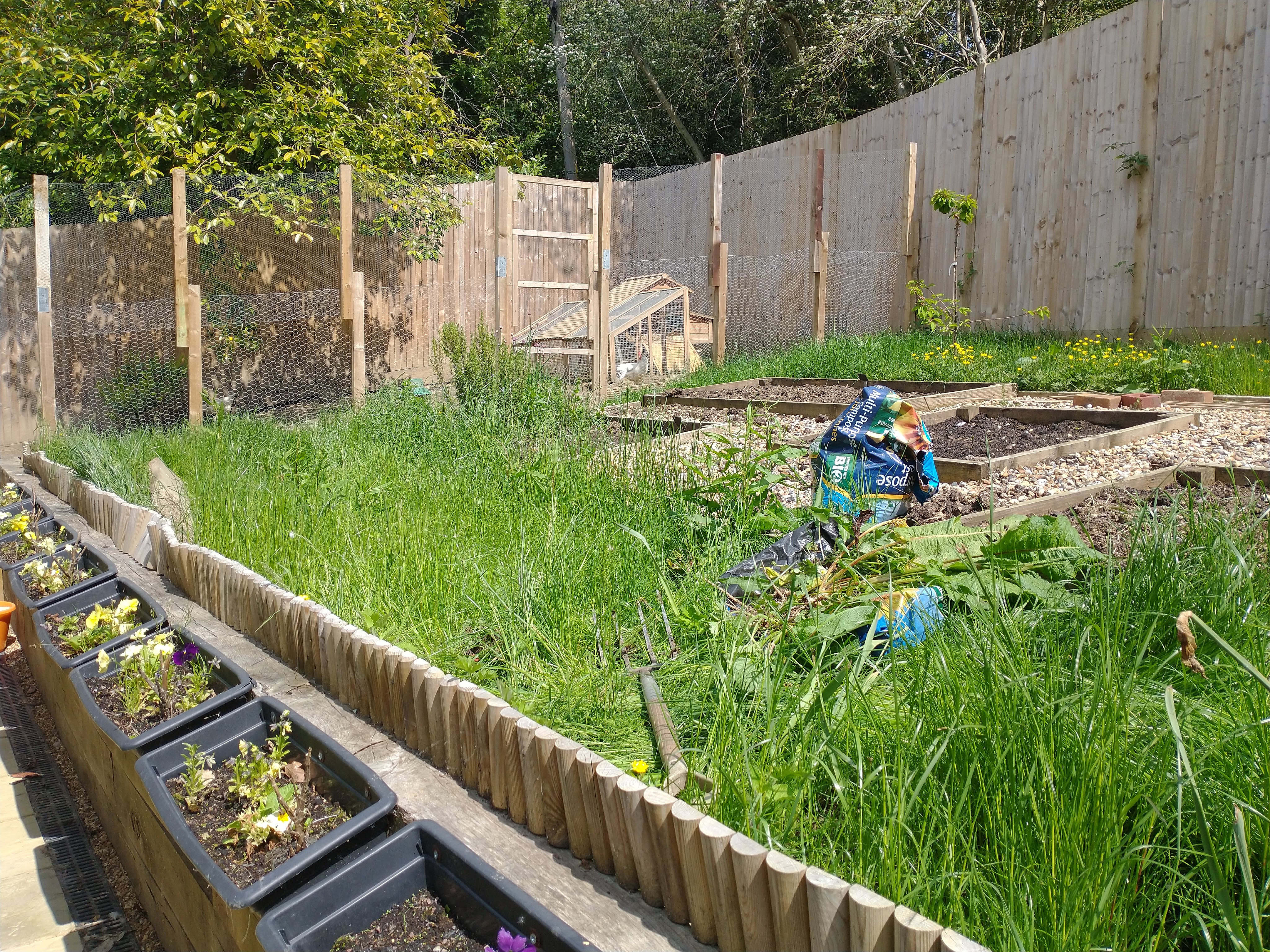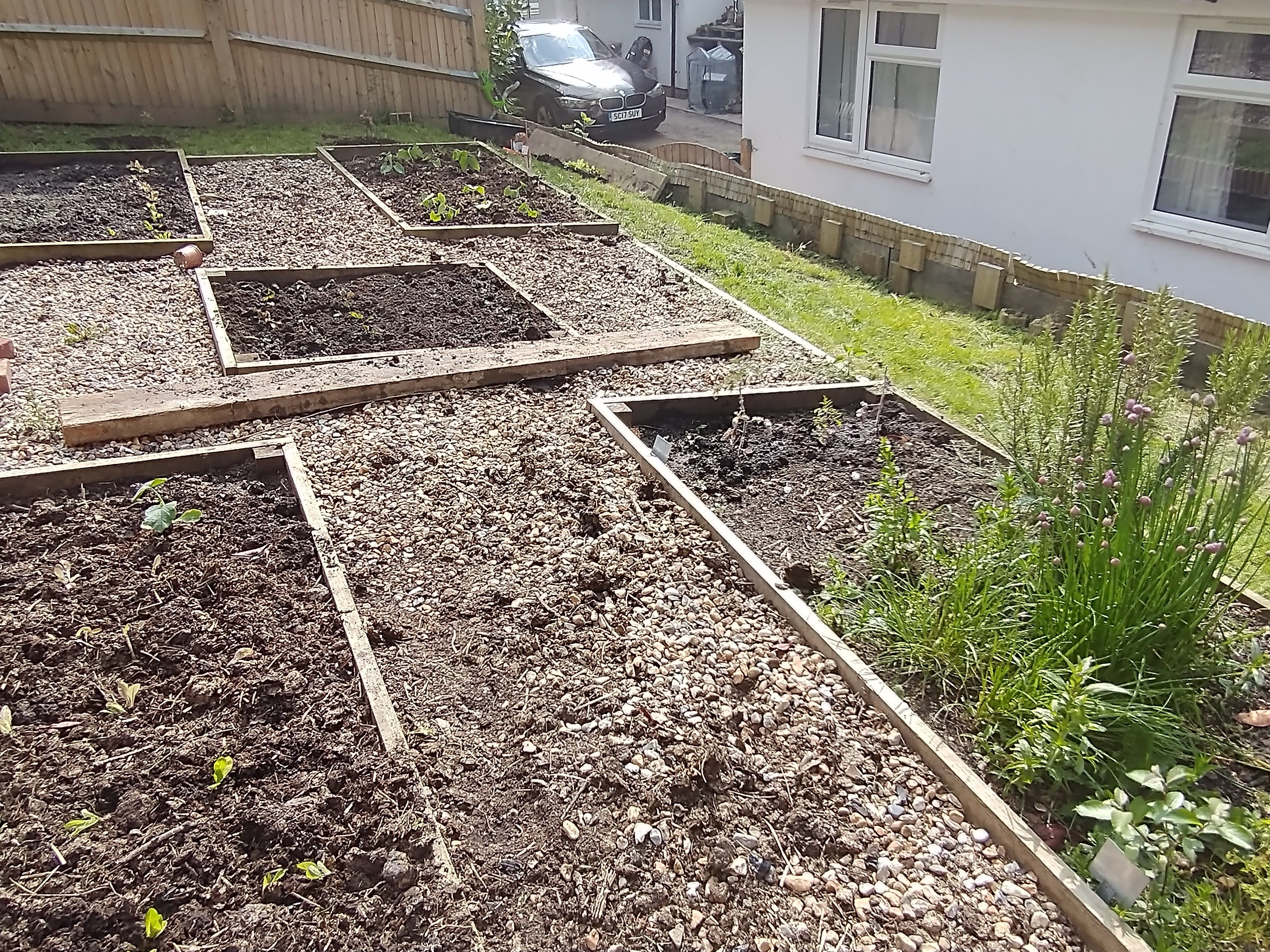 clearing an overgrown veggie plot and planting veggies; beans, butternut squash, courgettes, tomatoes, lettuce and beetroot.