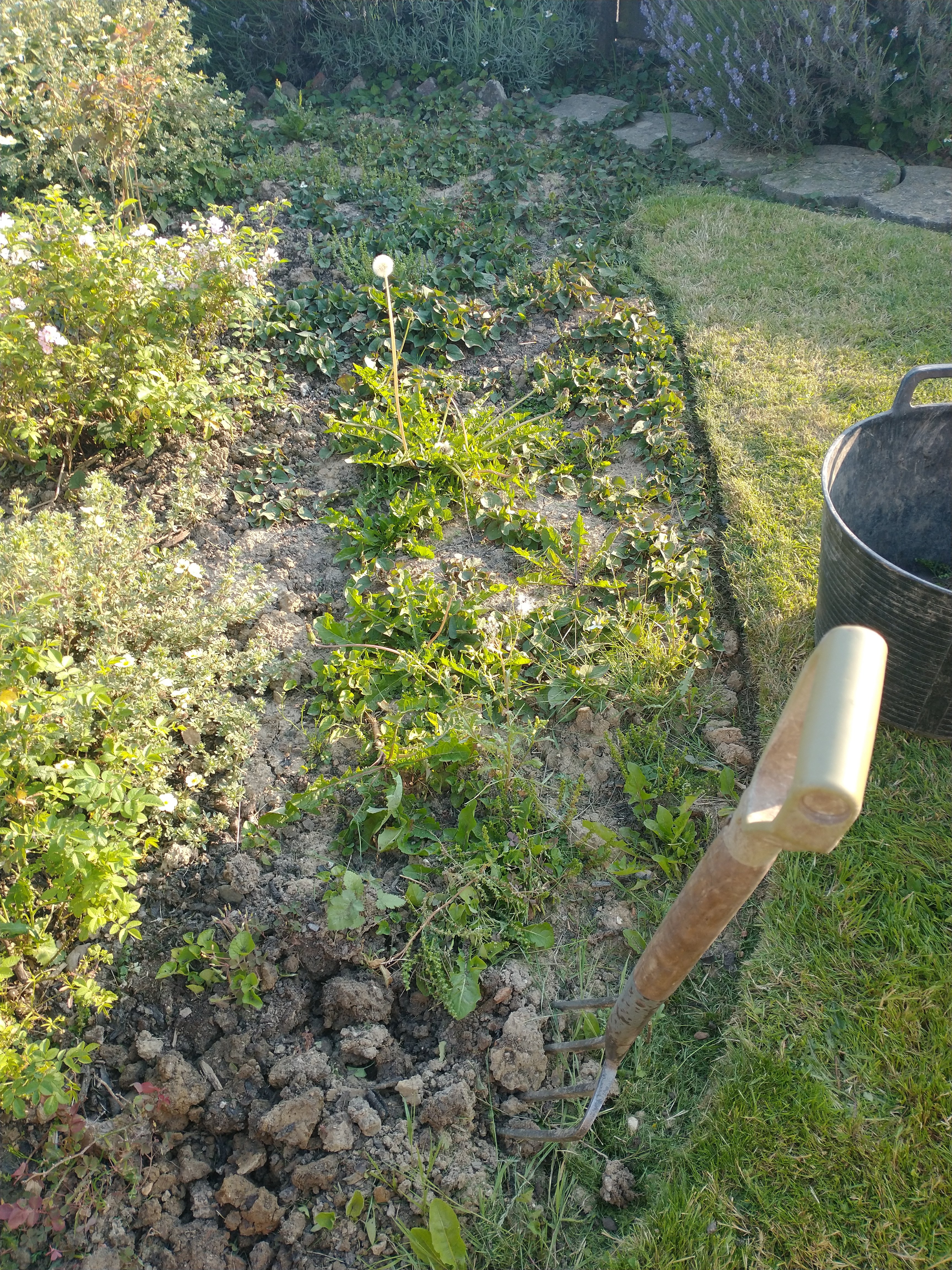 Well here in the South East of England, we were having a hot spell..(25 to 31 degrees C). Having lived in Málaga, and various other hot countries, this for me is “lovely” weather! Dry and sunny also means I can use those conditions to try and eliminate unwanted plants, whether they are weeds or just “unwanted”, like bindweed, Houttinya cordata.. Chameleon plant. These 2 have a network of roots which are difficult to remove so when the weather is hot I do the following: